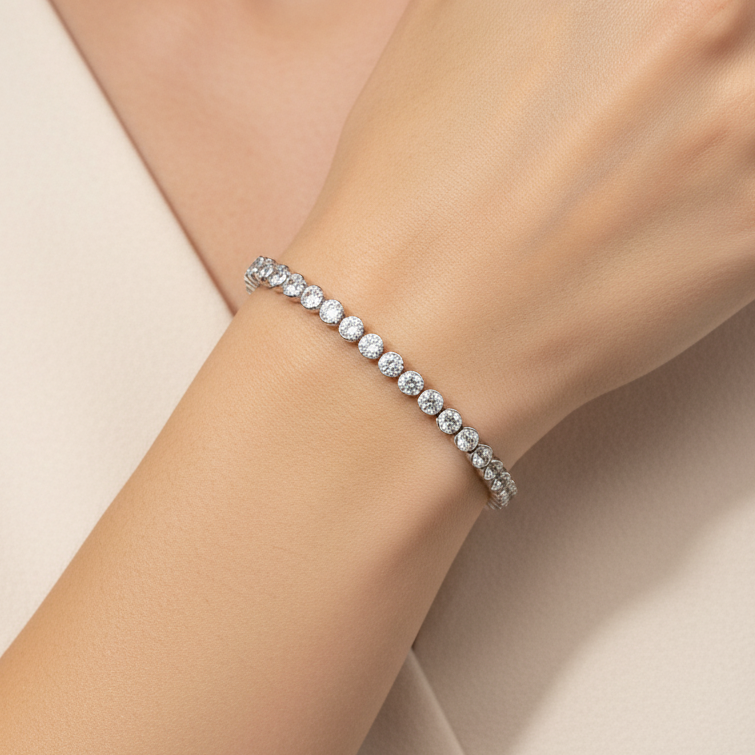 Poarta bratara Tennis Rotund impreuna cu coliere sau cercei discreti pentru un look elegant si rafinat. Se potriveste perfect cu rochii de seara sau tinute minimaliste de zi.
