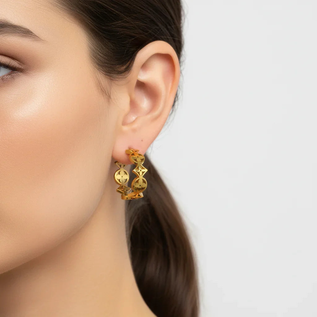 Completeaza-ti tinutele cu acesti cercei din inox eleganti placati cu aur 18K, creati pentru a oferi o nota de lux si stralucire oricarui look. Realizati din otel inoxidabil antialergic, acesti cercei combina designul sofisticat cu rezistenta de lunga durata, fiind ideali pentru purtare zilnica sau evenimente speciale.