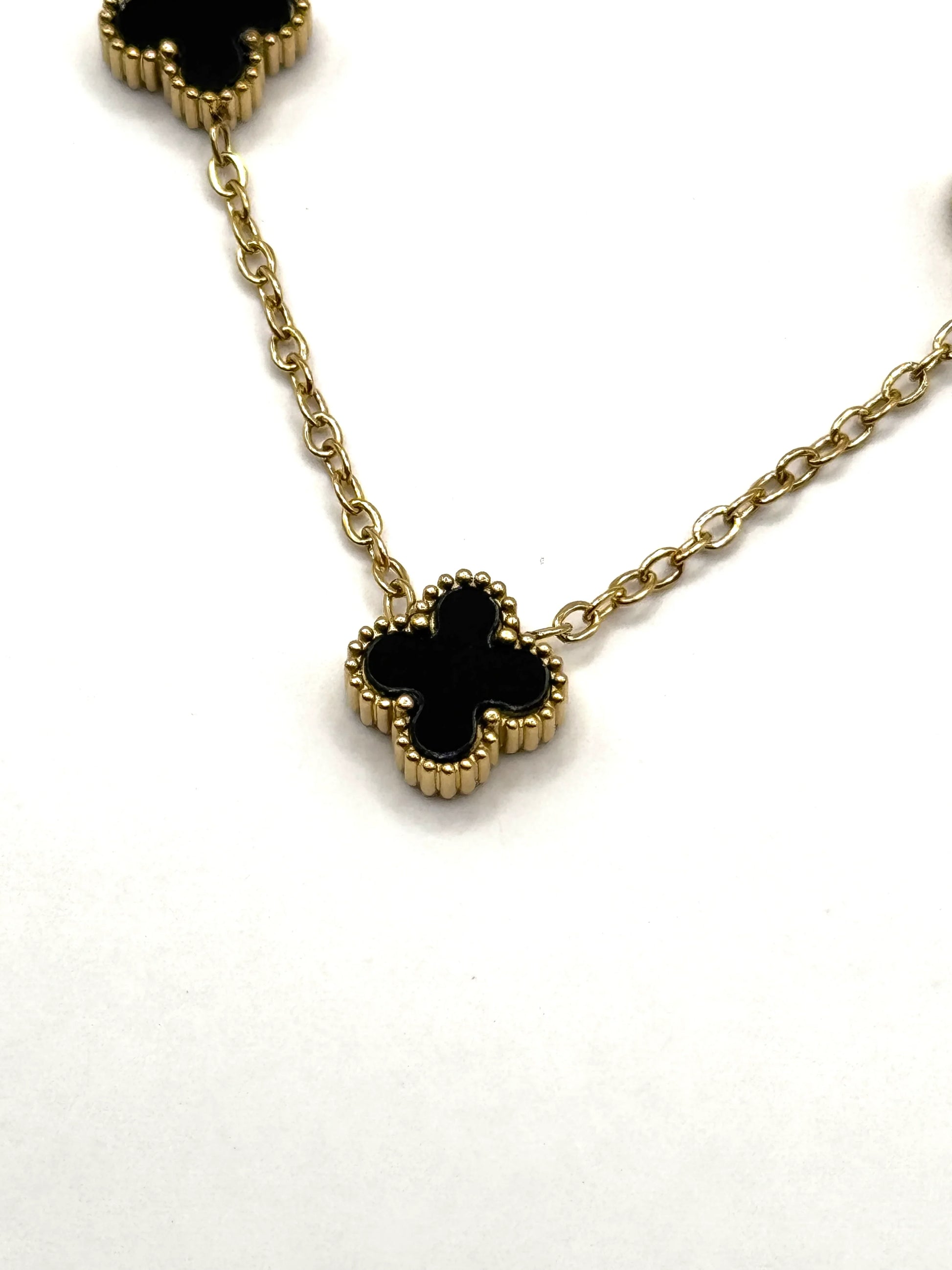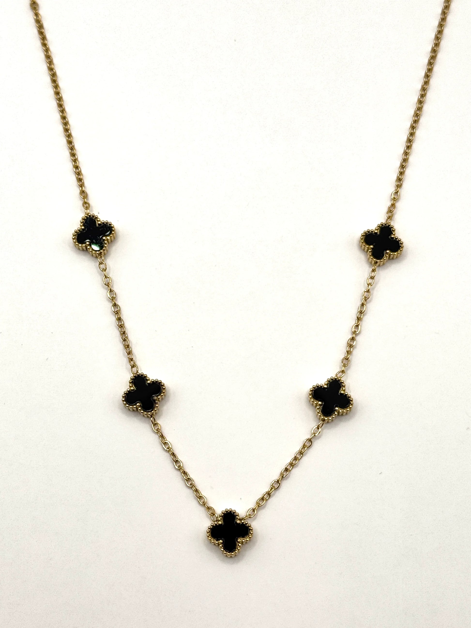 Colier damă auriu din inox cu 5 pandantive trifoi negru