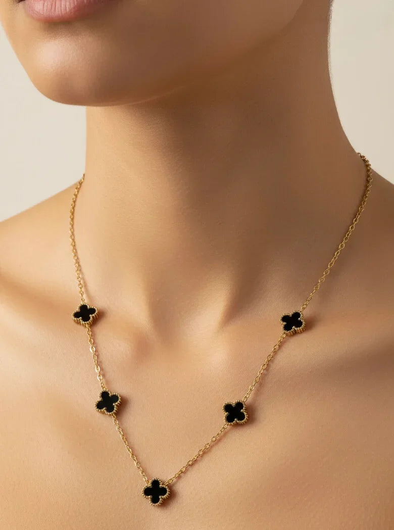 ✔ Design feminin și discret – cinci pandantive tip trifoi cu finisaj negru lucios, ce oferă contrast elegant cu lanțul auriu.