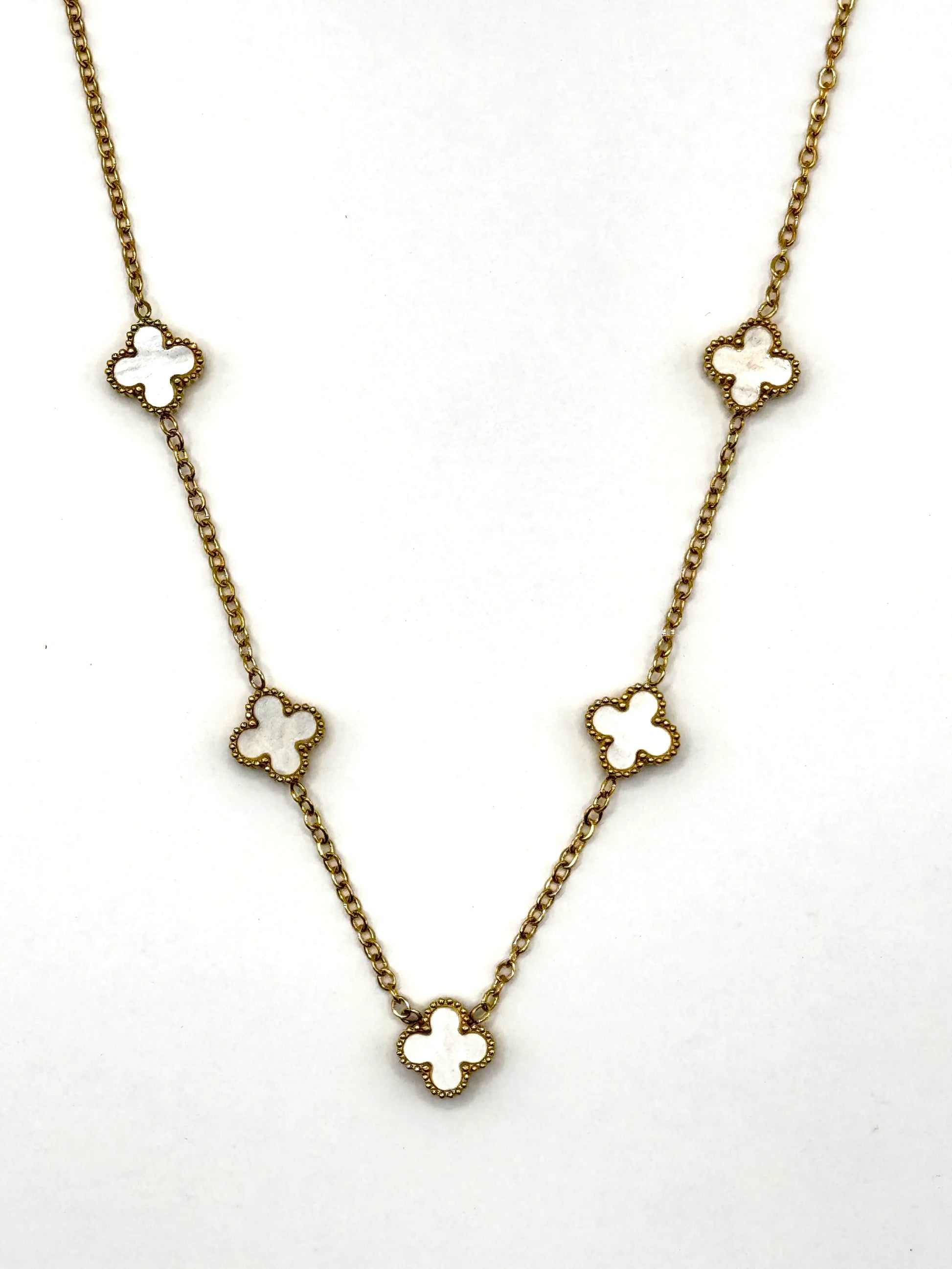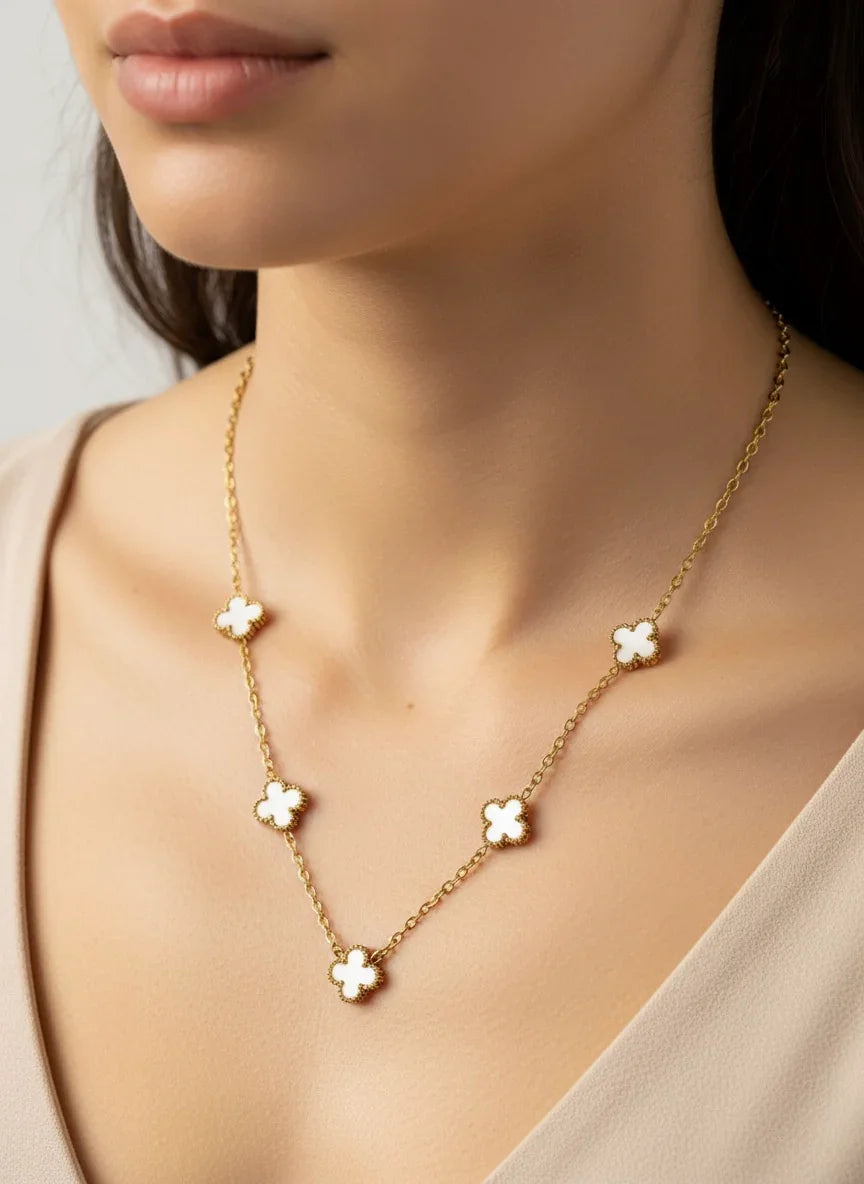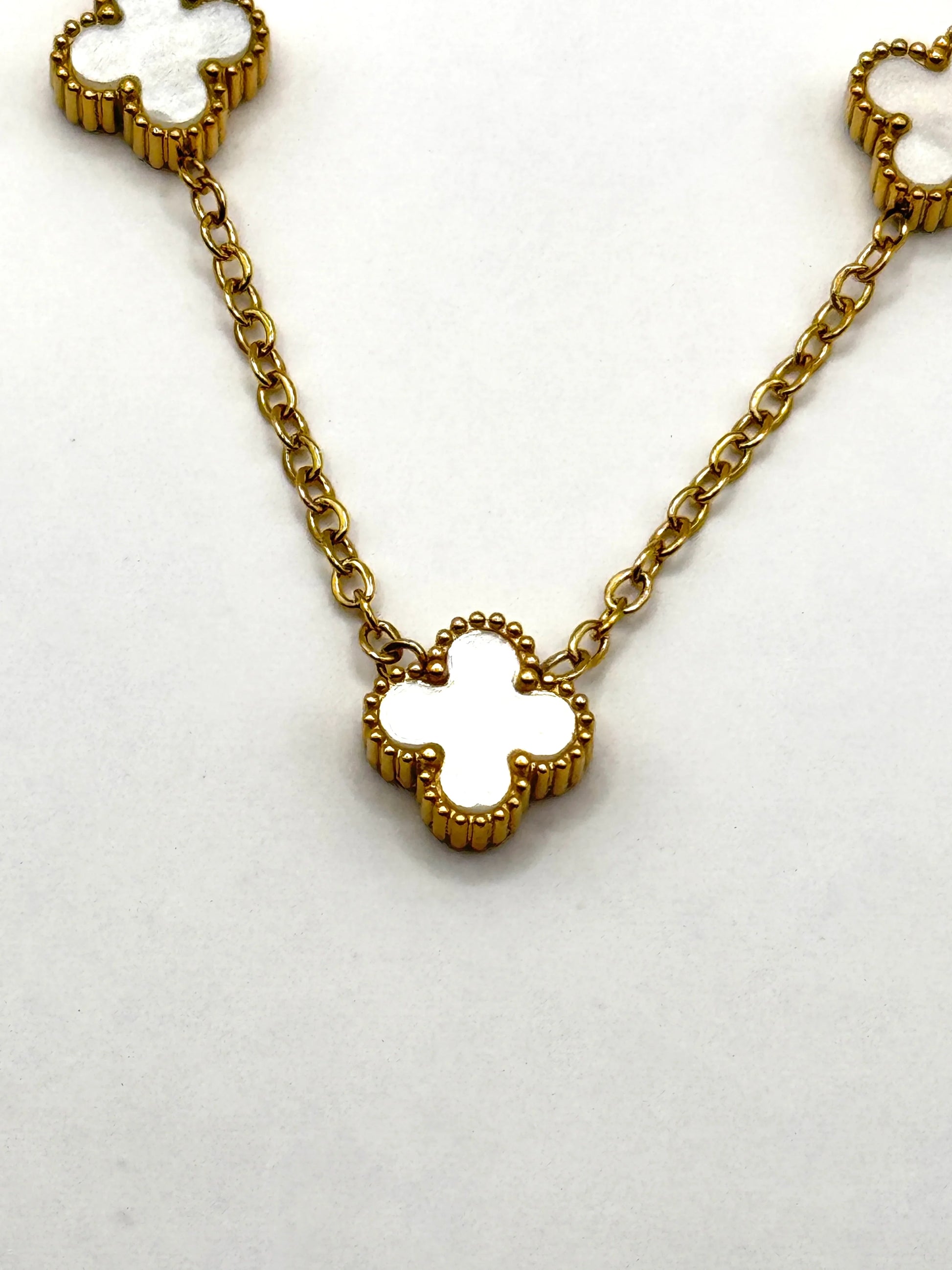 Colier damă auriu din inox cu 5 pandantive trifoi sidef alb