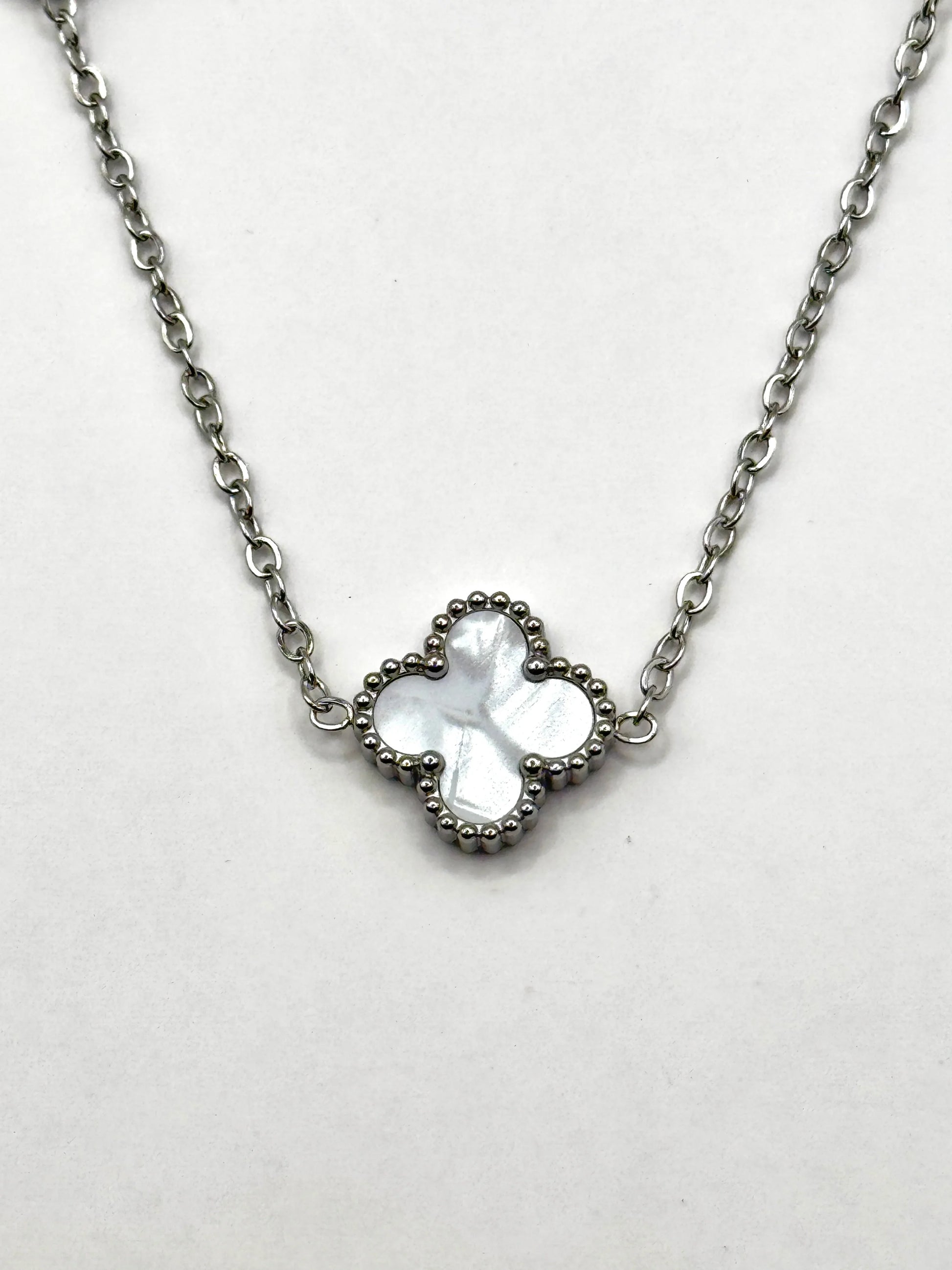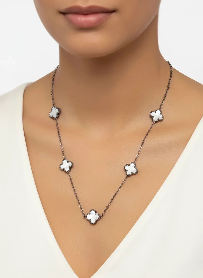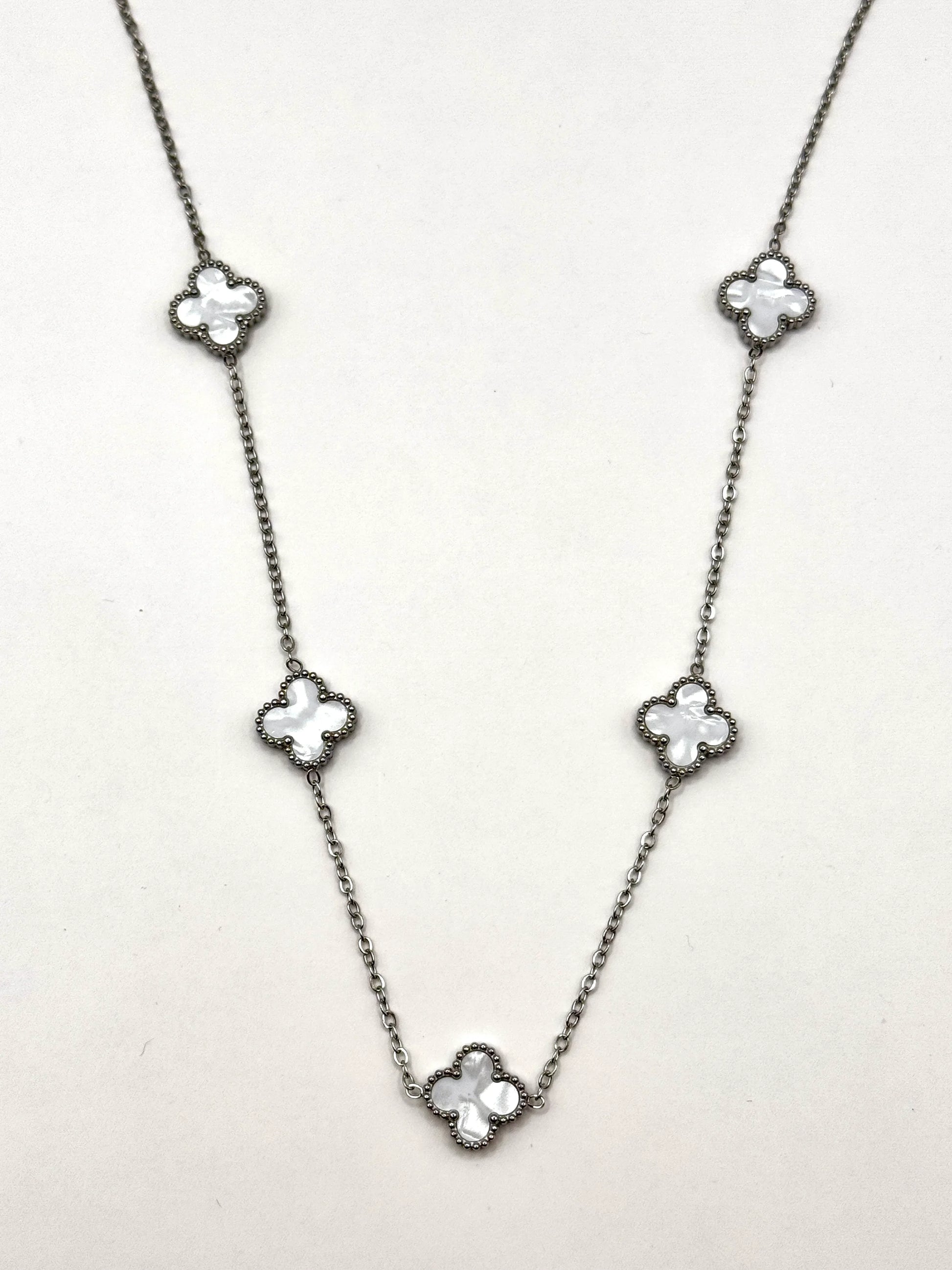 🌸 Colier dama din inox cu pandantive trifoi sidef alb – rafinament si stralucire delicata