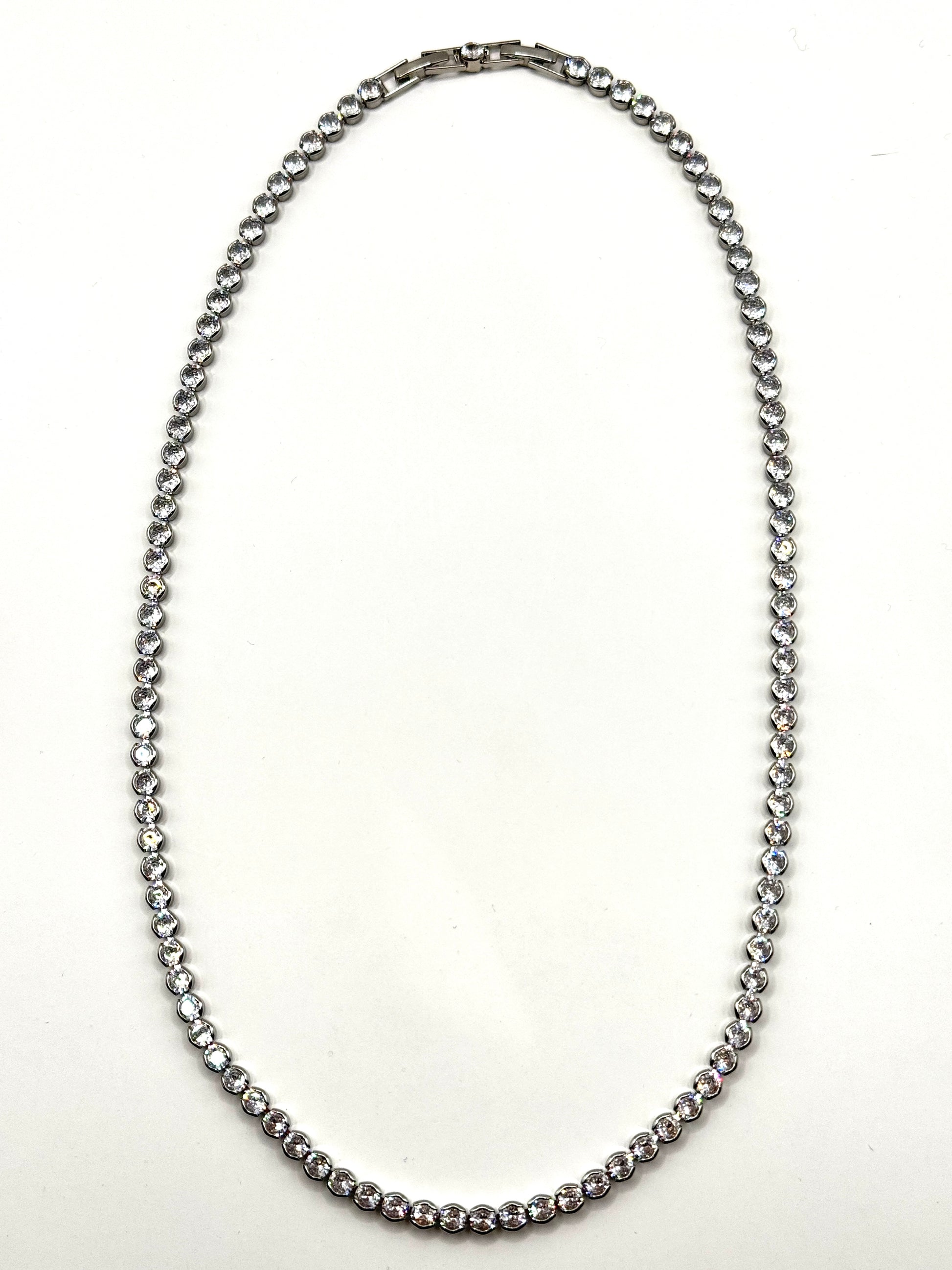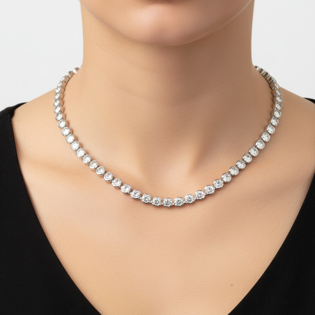 Poarta colierul Rotund Tennis impreuna cu cercei mici sau un inel delicat pentru un look elegant si sofisticat. Se potriveste perfect cu rochii de seara sau tinute minimaliste de zi.
