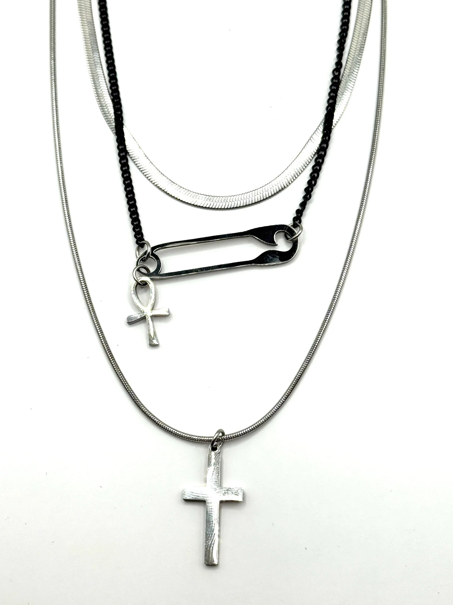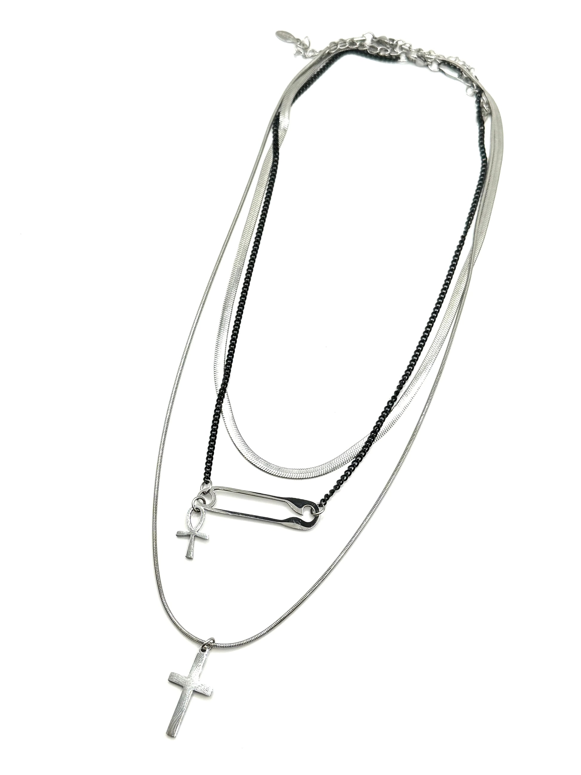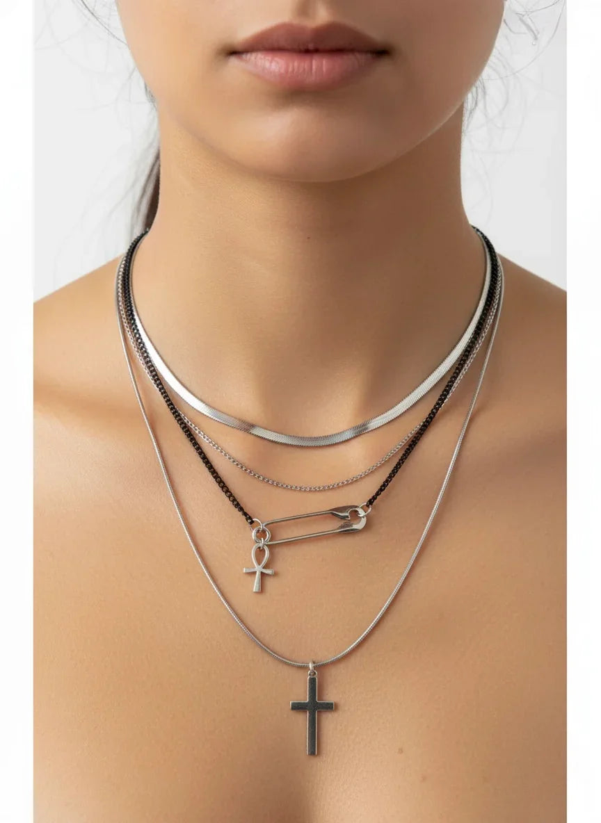 Completeaza-ti tinutele cu acest lant triplu cu pandantiv cruce si ac de siguranta, model snake din inox, cu marime reglabila. Designul modern si detaliat transforma lantul intr-o bijuterie statement, ideala pentru outfituri casual sau urbane. Fabricat din inox premium, lantul este durabil, rezistent la oxidare si antialergic, pastrandu-si aspectul in timp. Stilul snake adauga un aer original si indraznet, perfect pentru cei care doresc sa-si exprime personalitatea prin accesorii.