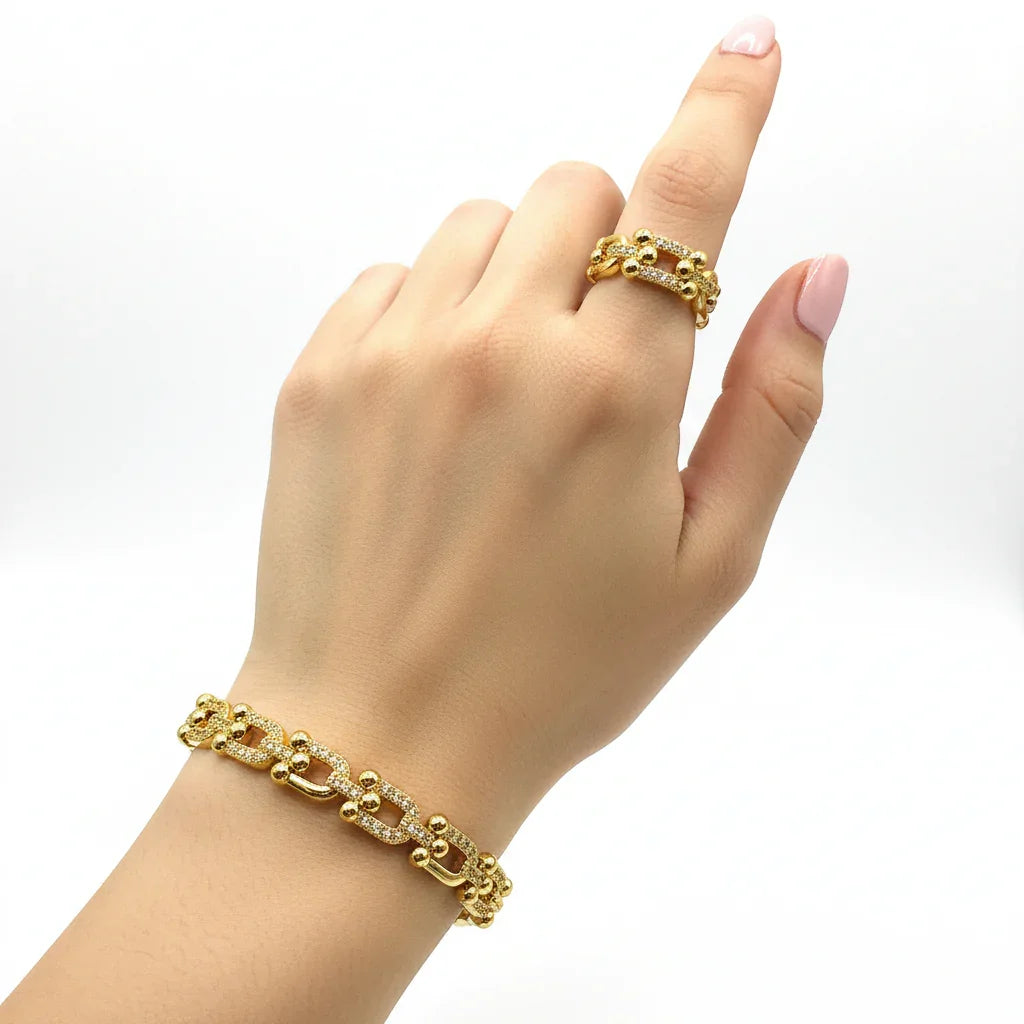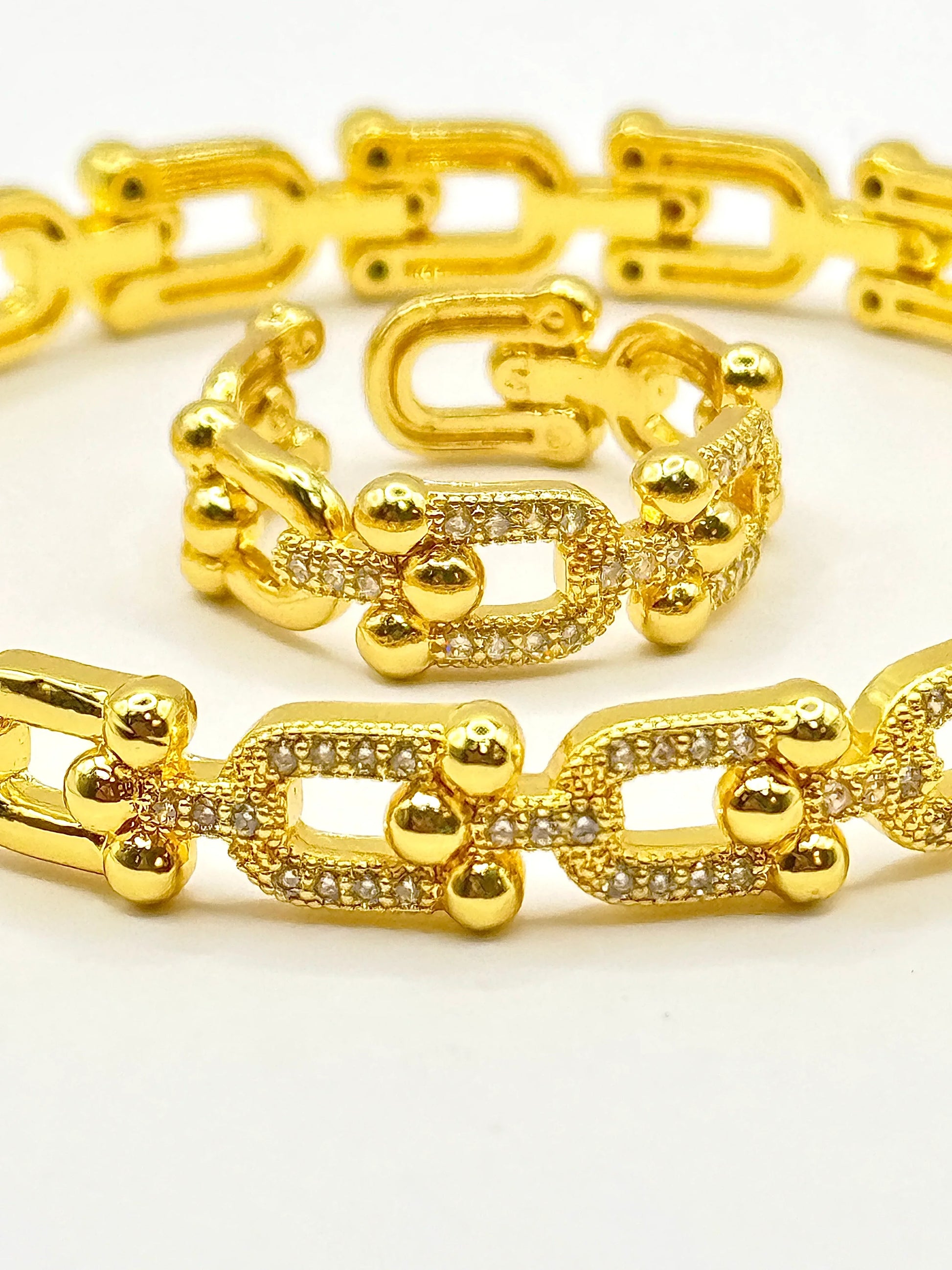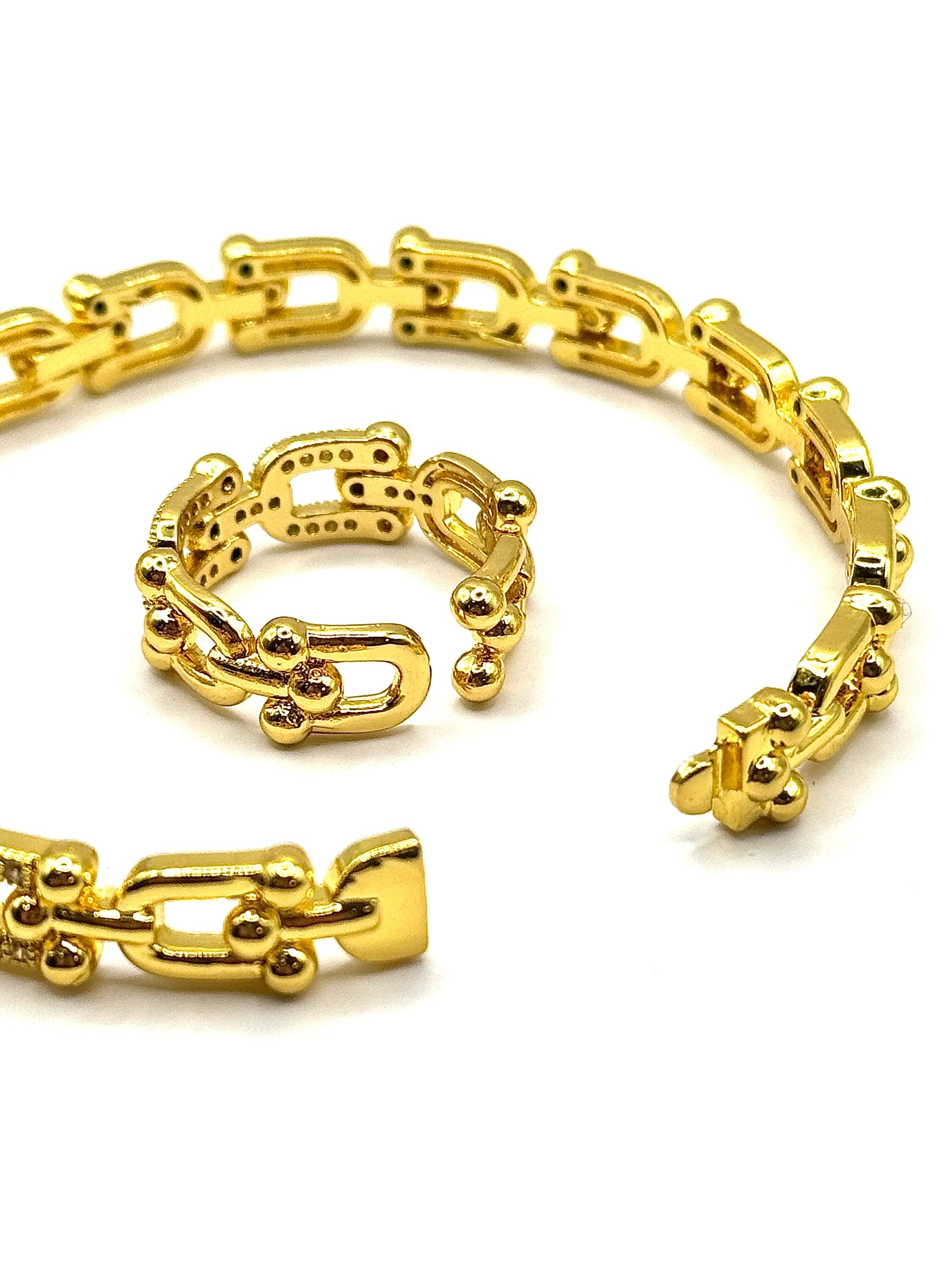 Setul Bratara si Inel Link aurii placate cu aur 18K adauga o nota de lux oricarui look, fiind o alegere perfecta pentru femeile care iubesc bijuteriile statement si rafinate.